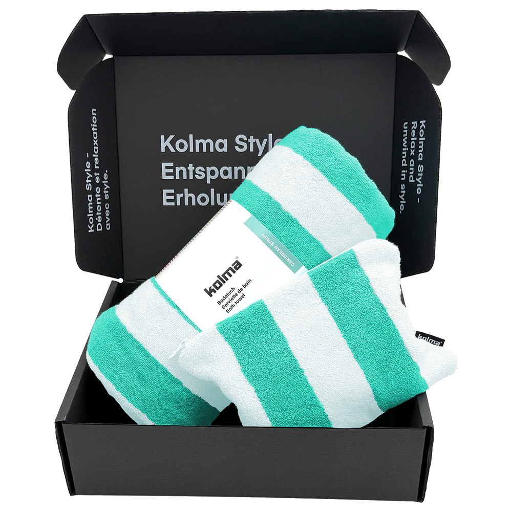 Das flauschige Badetuch sorgt für Komfort am Wasser, das passende Necessaire verstaut Sonnencreme und sonstige Essentials. Farblich abgestimmt und bereit für deinen nächsten Strand- oder Wellnesstag.